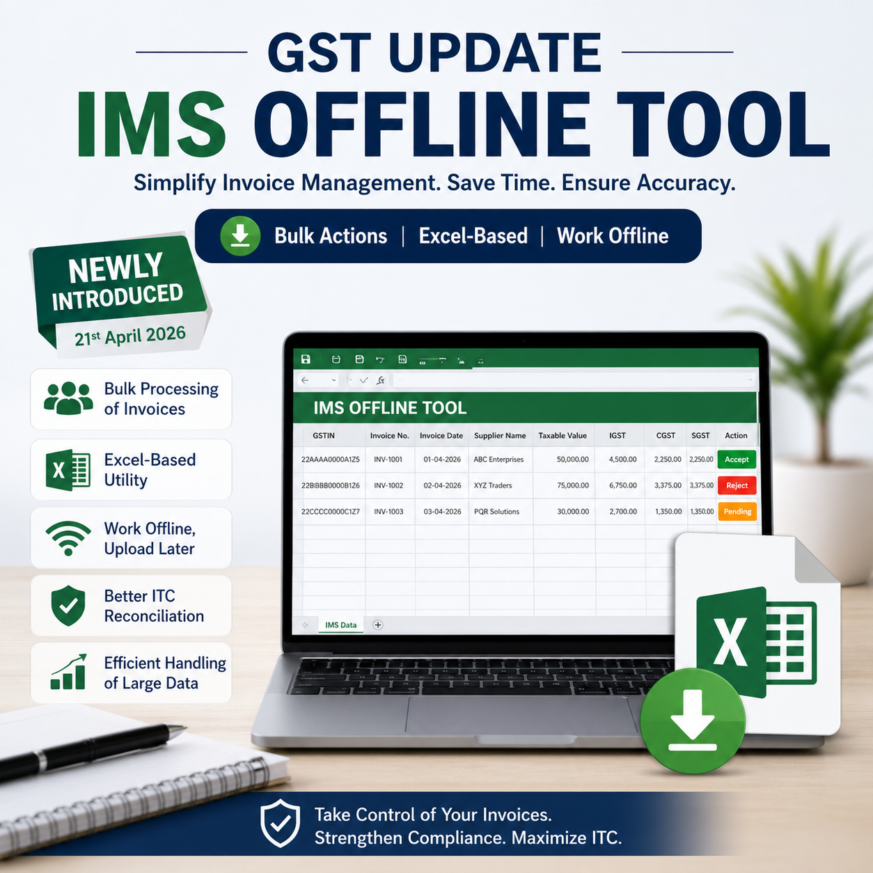 In a major move to enhance GST compliance efficiency, the GST Network (GSTN) rolled out the IMS (Invoice Management System) Offline Tool on 21st April 2026. This initiative is designed to simplify invoice-level activities for taxpayers and improve the reconciliation process.