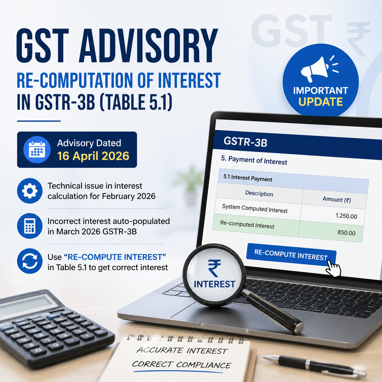 The GSTN has released a significant advisory dated 16 April 2026 regarding the recalculation of interest under Table 5.1 of GSTR-3B. The advisory highlights a technical issue where the system-generated interest for February 2026 was incorrectly computed and subsequently auto-populated in the March 2026 GSTR-3B for certain taxpayers.